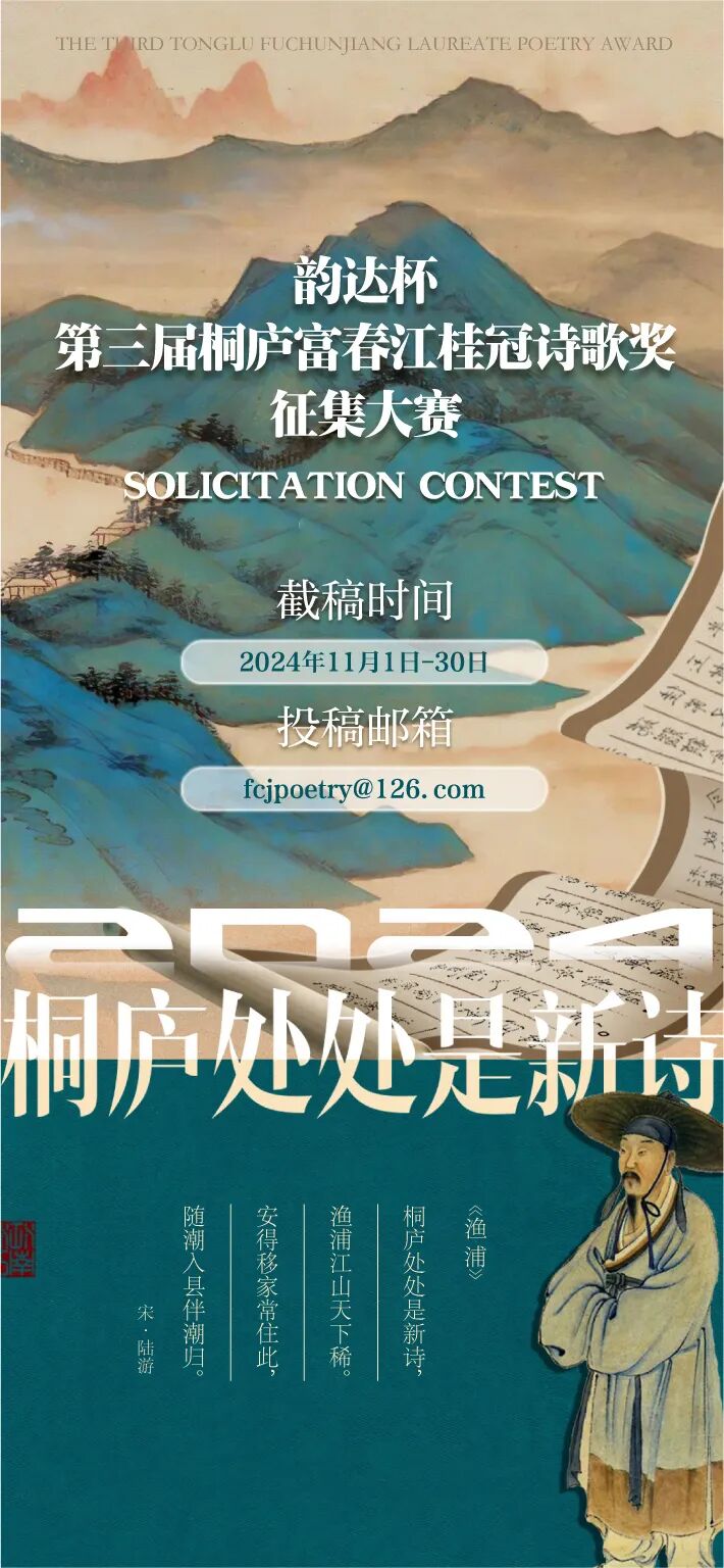 “2024桐庐处处是新诗-韵达杯·第三届桐庐富春江桂冠诗歌奖”诗歌创作征集大赛,将于2024年11月1日~30日举行。 桐庐是诗乡画城,汉代严子陵隐居在此,宋代范仲淹任官来此,元代黄公望挥毫于此。这片天下独绝的奇山异水,是中国诗与中国画的灵感源头之一。 唐代孟浩然、刘长卿、白居易、杜牧、皎然、贯休,宋代苏轼、陆游、范成大、杨万里、李清照、姜夔、张孝祥、刘克庄……对桐庐无不流连忘返,留下了数量众多的诗歌。 陆游诗云:“桐庐处处是新诗,渔浦江山天下稀。安得移家常住此,随潮入县伴潮归。”传承古典文化的同时,今天的诗人,也应该用自己的语言激活传统,构建新时代的“桐庐处处是新诗”。本次活动也是为迎接即将到来的桐庐建县1800周年,丰富桐庐“诗乡画城”的文化内涵。 本次大赛征集面向国内外,现代诗、旧体诗词均可,每件作品50行以内。大赛邀请全国知名诗人、评论家担任评委,实行盲审制,公平、公正、公开。 一、赛程时间 2024年11月1日~30日 二、组别分类 A儿童组(小学及幼儿);B少年组(初中和高中);C成年组(高校学生及成人)。三、评选环节 由选手投稿、初选、复选、决选、结果公布和颁奖典礼六个环节组成。四、选拔方式 由大赛指定的评委完成初审、复审、终审的评审工作。五、评审团名单 吉狄马加 (诗人、中国少数民族作家学会名誉会长、中国作家协会诗歌委员会主任) 陈先发 (诗人、鲁迅文学奖获得者、安徽省文联主席) 高兴 (诗人、翻译家、中国社会科学院博导,原《世界文学》主编) 敬文东 (诗人、诗评家、中央民族大学教授) 江弱水 (诗人、诗评家、浙江大学教授) 杨小滨 (诗人、诗评家、台北中研院中国文哲所研究员) 西渡 (诗人、诗评家、清华大学教授) 臧棣 (诗人、鲁迅文学奖获得者、北京大学长聘副教授) 颜炼军 (诗人、诗评家、南京大学教授) 舒羽 (诗人、作家,桐庐文化大使、桐庐富春江诗歌节创办人) 六、奖项设置 1.年度桂冠诗人奖:1名(奖金30000元+奖杯+奖状+采风使用金10000元) 2.年度金桂奖:3名(每人奖金10000元+奖杯+奖状+采风使用金3000元) 3.年度丹桂奖:3名(每人奖金5000元+奖杯+奖状+采风使用金1500元) 4.年度银桂奖:3名(每人奖金3000元+奖杯+奖状+采风使用金1000元) 5.年度佳作提名奖:每组10名(共30名/奖状) 6.年度最佳组织奖:5家单位(奖牌) 备注:奖金为税前现金,“采风使用金”含获奖者赴桐庐创作采风(赛后使用亦可)的交通、住宿、餐饮、旅游观光等。 七、赛程安排