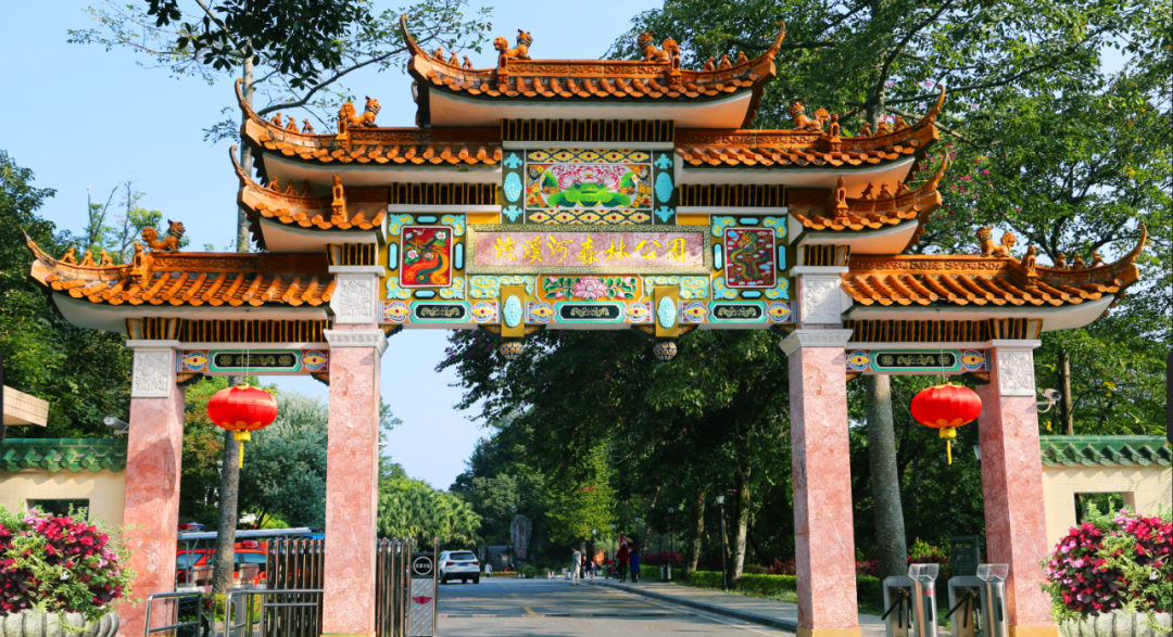 公园牌坊:流溪河森林公园正门牌坊是一座具有民族风格4柱3门4重檐的仿古式建筑。黄色琉璃瓦顶,枣红色大理石方柱,雕有龙凤花草,正中横额上刻有前中共中央总书记胡耀邦题写的“流溪河森林公园”7个金色大字,褚红色底,在阳光照耀下熠熠生辉,潇洒活泼,蔚为壮观。
