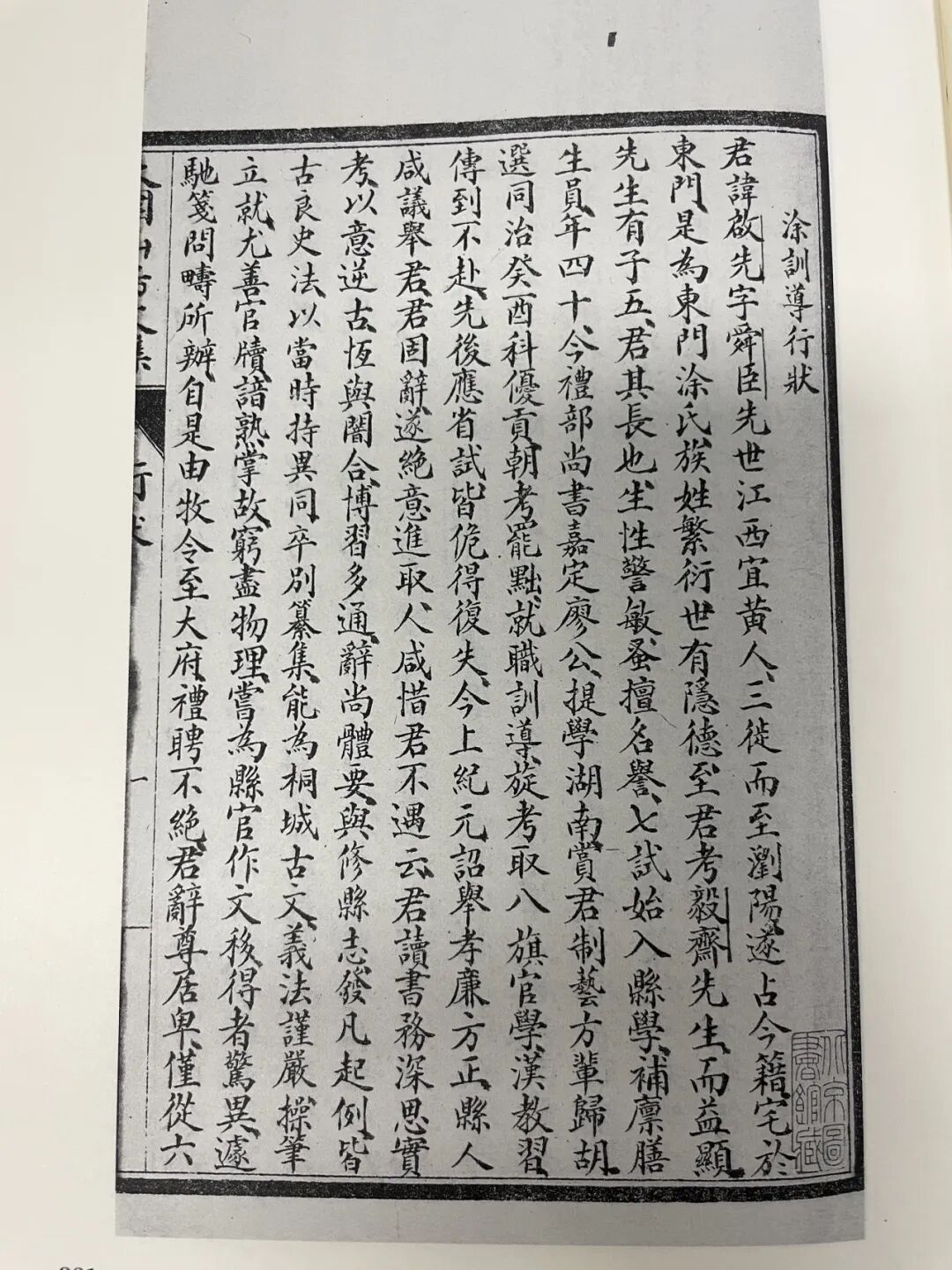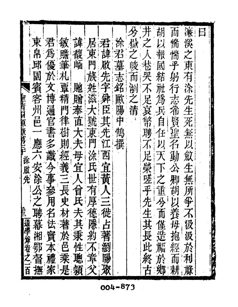 《涂训导行状》(清)欧阳中鹄君讳启先,字舜臣,先世江西宜黄人,三徙而至浏阳,遂占今籍,宅于东门,是为东门涂氏。族姓繁衍,世有隐德,至君考毅斋先生而益显。先生有子五,君其长也。生性警敏,蚤擅名誉,七试始入县学,补廪膳生员。年四十,今礼部尚书嘉定廖公提学湖南,赏君制艺,方辈归胡,选同治癸酉科优贡。朝考罢黜,就职训导。旋考取八旗官学汉教习,传到不赴。先后应省试,皆佹得复失。今上纪元诏举孝廉方正,县人咸议举君,君固辞,遂绝意进取,人咸惜君不遇云。