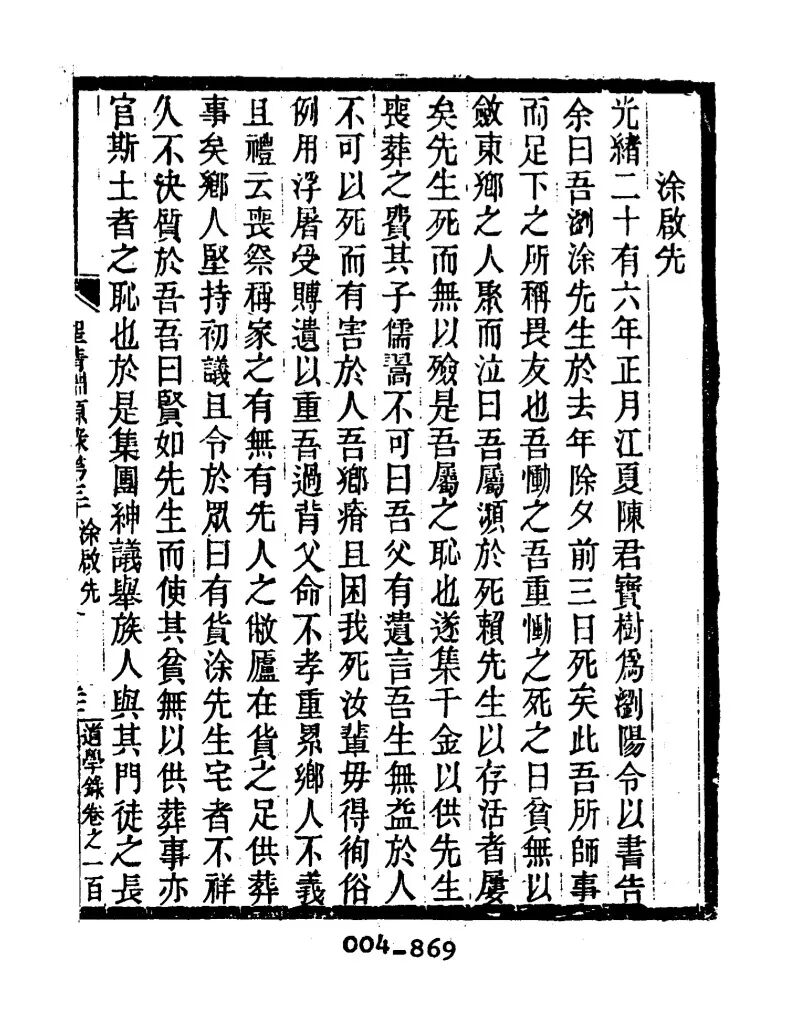 《圣清渊源录•涂启先》(清)黄嗣东光绪二十有六年正月,江夏陈君宝树为浏阳令,以书告余曰:吾浏涂先生于去年除夕前三日死矣!此吾所师事而足下之所称畏友也。吾恸之!吾重恸之!死之日,贫无以敛。东乡之人聚而泣曰:“吾属濒于死,赖先生以存活者屡矣。先生死而无以殓,是吾属之耻也!”遂集千金以供先生丧葬之费。其子儒翯不可,曰:“吾父有遗言:‘吾生无益于人,不可以死而有害于人。吾乡瘠且困,我死,汝辈毋得徇俗例,用浮屠,受赙遗,以重吾过。’背父命,不孝;重累乡人,不义,且《礼》云:‘丧祭,称家之有无。’有先人之敝庐在,货之足供葬事矣。”乡人坚持初议,且令于众曰:“有货涂先生宅者,不祥。”久不决,质于吾,吾曰:“贤如先生,而使其贫无以供葬事,亦官斯土者之耻也。”于是集团绅议,举族人与其门徒之长且贤者,使主先生丧事而质其宅,得五百金,不足则称贷于乡人以益之。乡人大和。