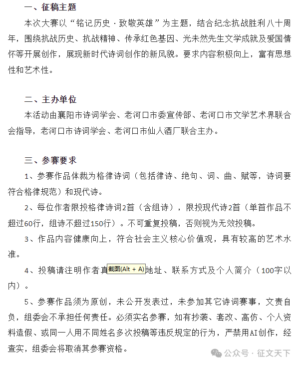 老河口市首届“光未然杯”纪念抗日战争胜利八十周年诗词大赛征稿启事